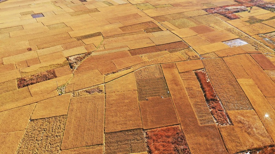 Vue aérienne de champs de riz à Luanzhou, dans la province chinoise du Hebei (nord), le 29 octobre 2021. (Photo : Zhu Xudong)