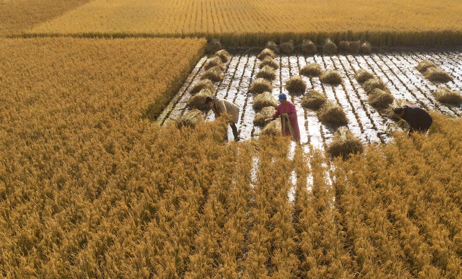 Photo aérienne d'agriculteurs récoltant du riz à Luanzhou, dans la province chinoise du Hebei (nord), le 29 octobre 2021. (Photo : Zhu Xudong)