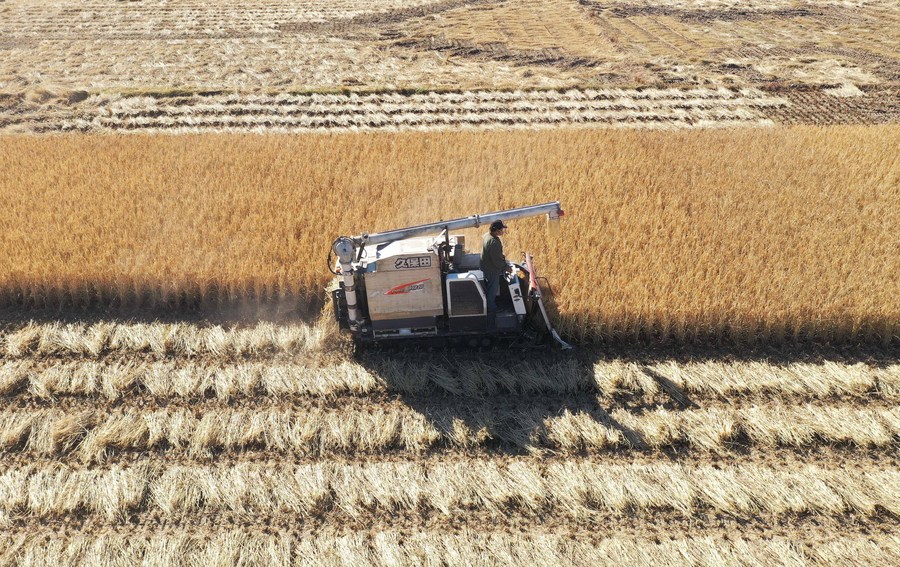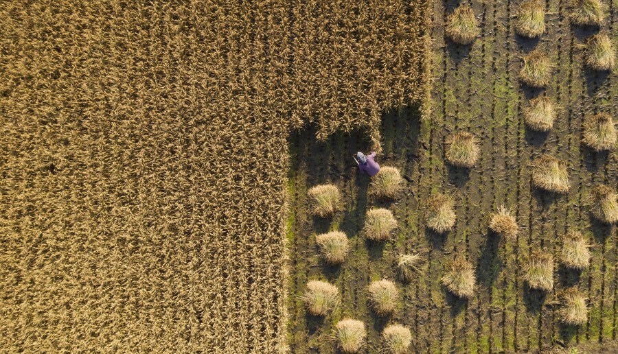 Photo aérienne d'un agriculteur récoltant du riz à Luanzhou, dans la province chinoise du Hebei (nord), le 29 octobre 2021. (Photo : Zhu Xudong)