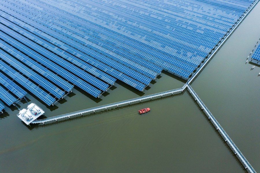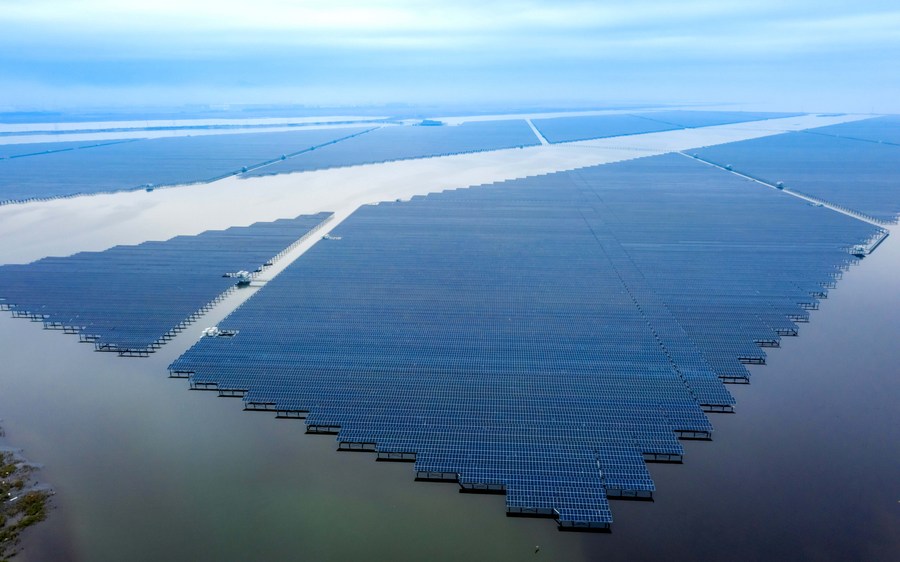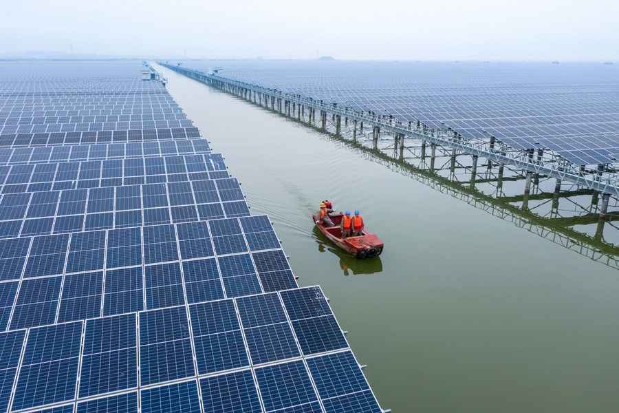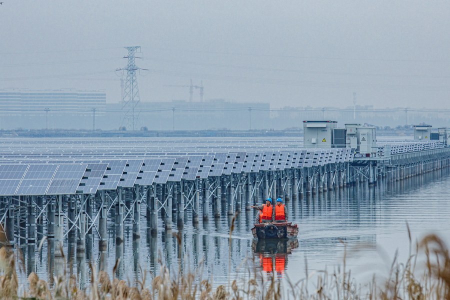 Des personnes inspectent une centrale photovoltaïque de 550 mégawatts, à Wenzhou, dans la province chinoise du Zhejiang (est), le 15 décembre 2021. (Photo : Xu Yu)