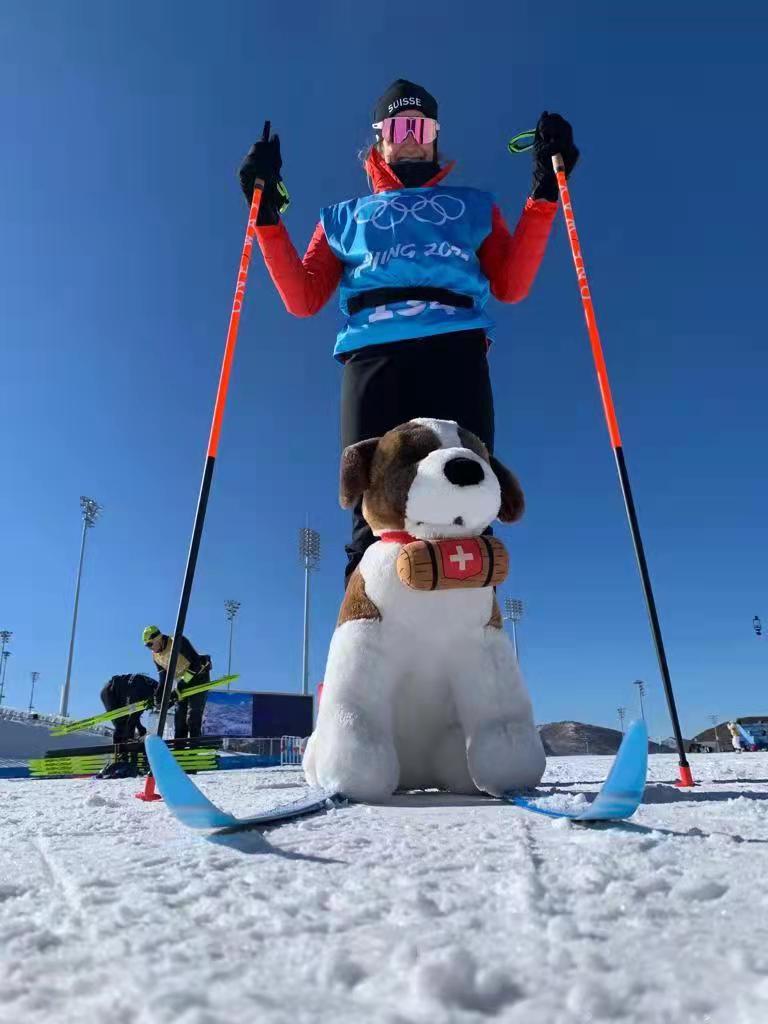 La mascotte suisse Barry avec l'athlète Alina Meier au centre de cross-country de Zhangjiakou.(Ralph Stockli)