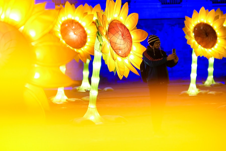 Un homme prend des photos d'installations lumineuses artistiques lors de Bright Brussels, festival des lumières, à Bruxelles, capitale belge, le 10 février 2022. (Photo : Zhang Cheng)■