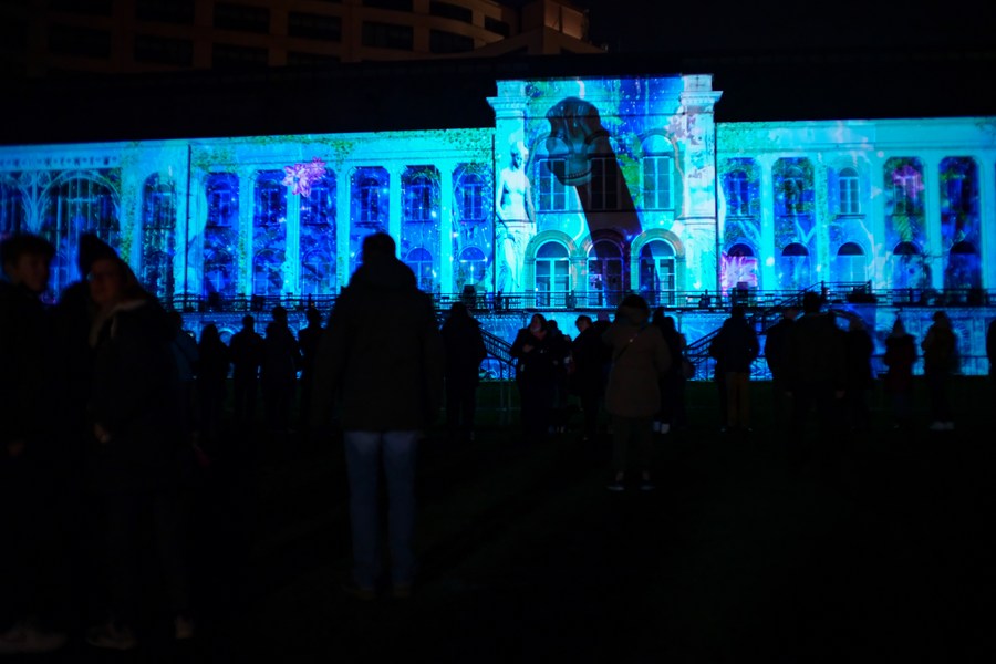 Des gens apprécient un spectacle de sons et de lumières lors de Bright Brussels, festival des lumières, à Bruxelles, capitale belge, le 11 février 2022. (Photo : Zhang Cheng)