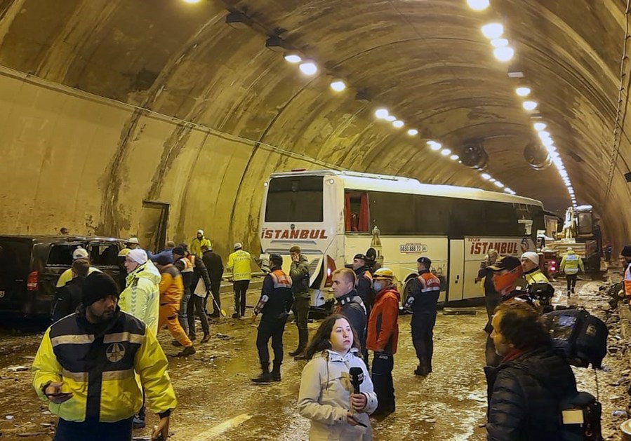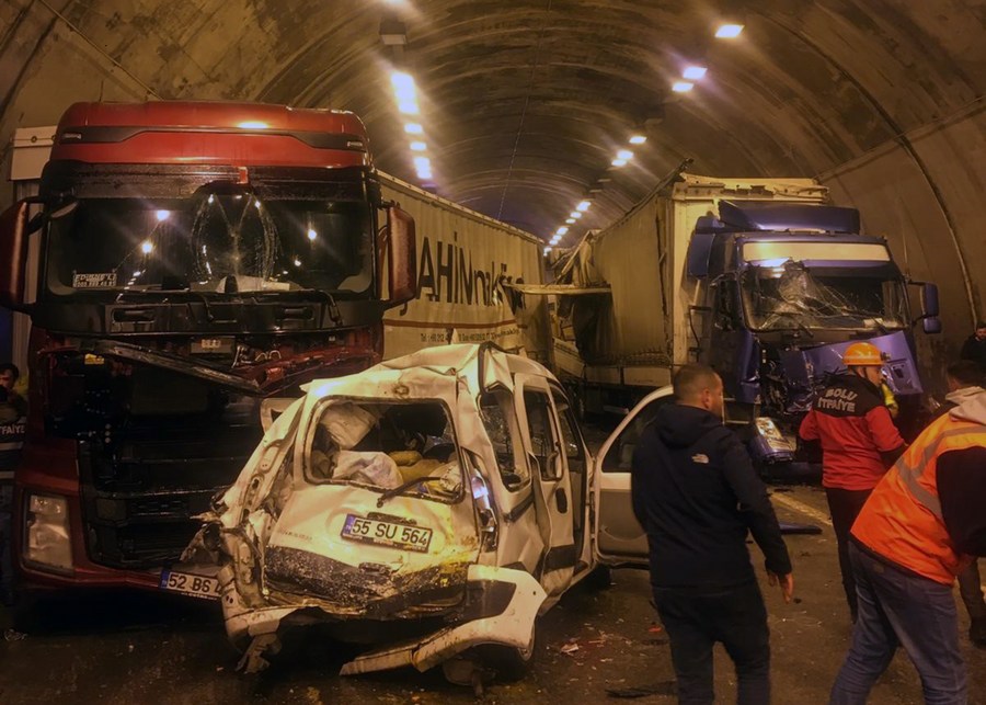 La scène de l'accident de la circulation dans le tunnel du Mont Bolu sur l'autoroute Ankara-Istanbul, dans le nord-ouest de la Turquie, le 19 mars 2022. (Xinhua)