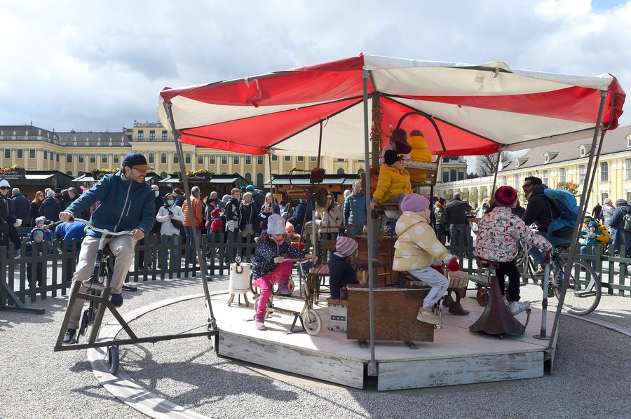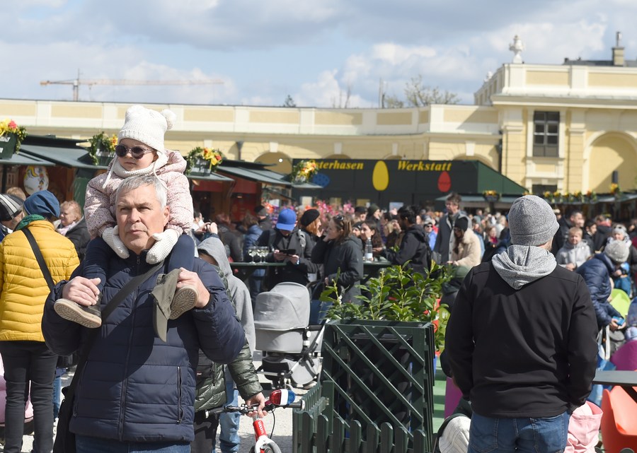 Des gens visitent le marché de Pâques du château de Schönbrunn, à Vienne, en Autriche, le 10 avril 2022. (Photo : Guo Chen)