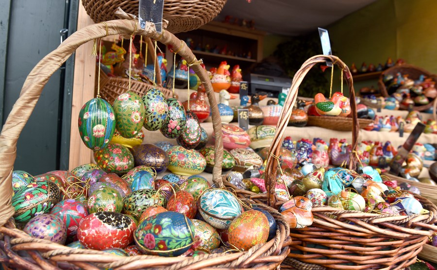 Des oeufs de Pâques dans le marché de Pâques du château de Schönbrunn, à Vienne, en Autriche, le 10 avril 2022. (Photo : Guo Chen)
