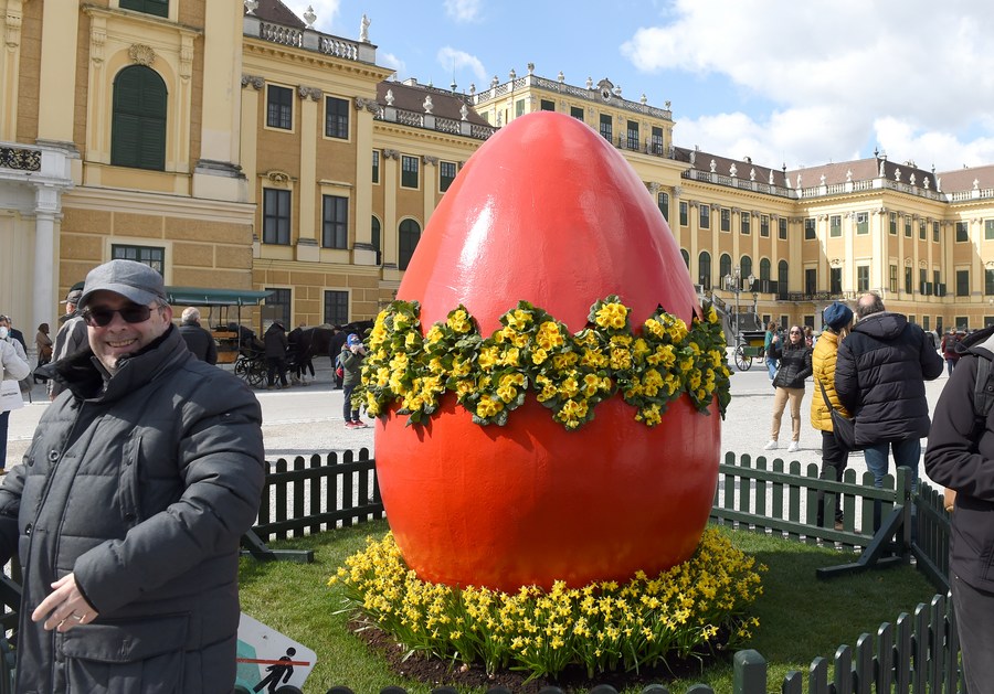 Sculpture d'un oeuf de Pâques géant dans le marché de Pâques du château de Schönbrunn, à Vienne, en Autriche, le 10 avril 2022. Un marché de Pâques est installé du 2 au 19 avril et attire beaucoup de visiteurs. (Photo : Guo Chen)