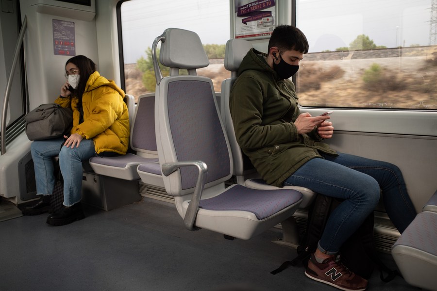 Des personnes portant des masques à bord d'un train de banlieue à Madrid, en Espagne, le 8 février 2021.(Xinhua/Meng Dingbo)