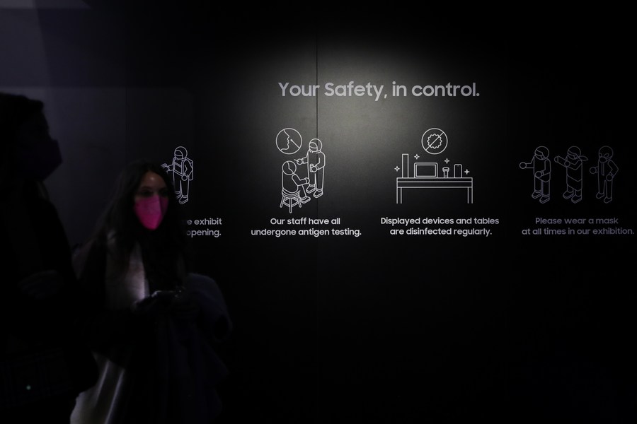 Photo prise le 3 mars 2022 montrant un panneau sur la prévention de la COVID-19 lors du Congrès mondial du mobile (MWC) à Barcelone, en Espagne. (Xinhua/Zheng Huansong)