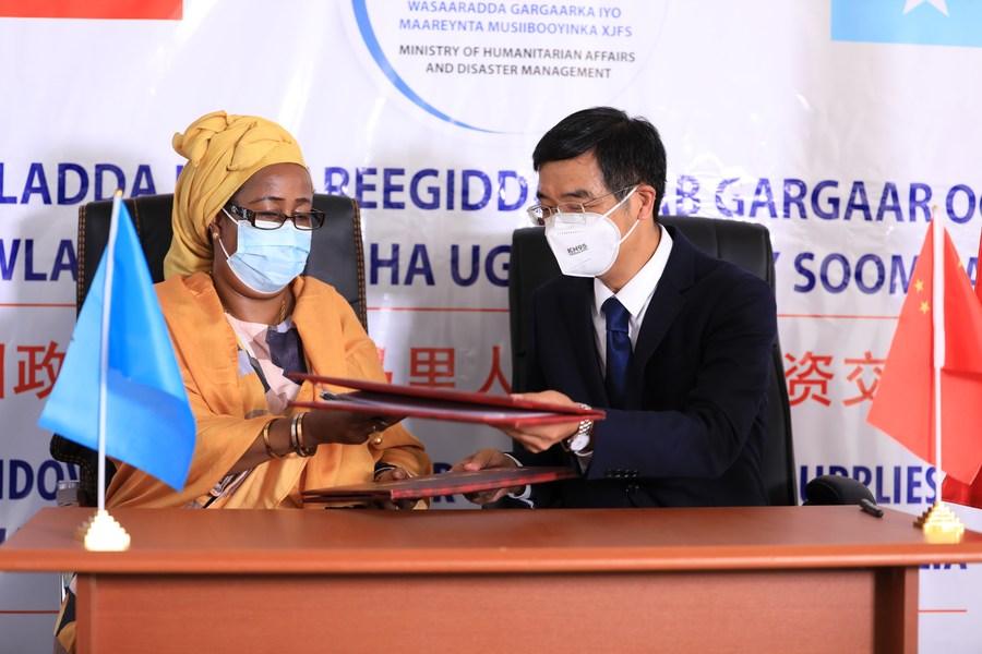 Fei Shengchao (droite), l'ambassadeur de Chine en Somalie, échange des documents avec Khadijo Mohamed Diriye, ministre somalienne des Affaires humanitaires et de la Gestion des catastrophes, au cours d'une cérémonie de remise de l'aide humanitaire offerte par le gouvernement chinois à la Somalie à Mogadiscio, la capitale somalienne, le 16 octobre 2021. (Xinhua/Hassan Bashi)