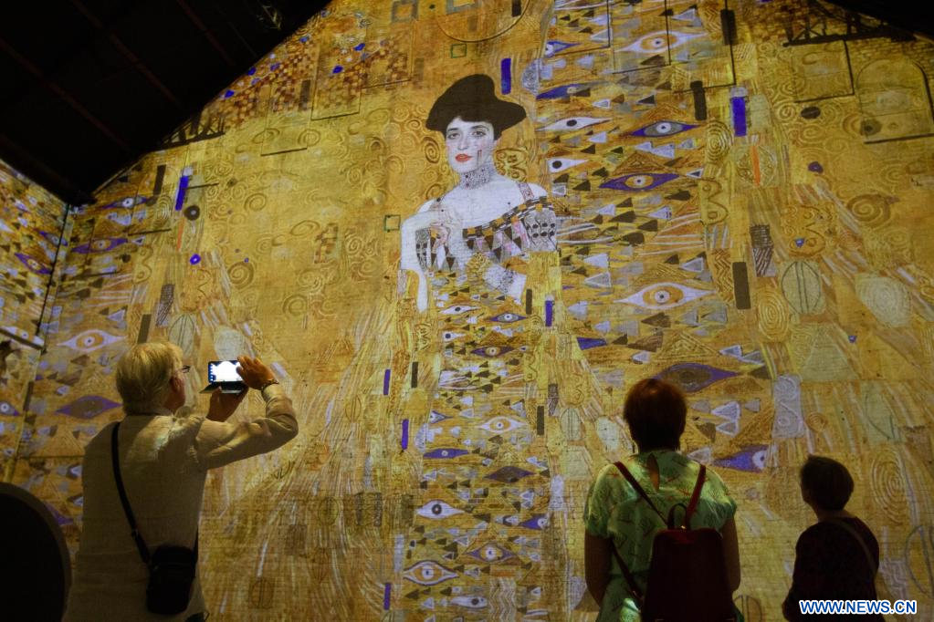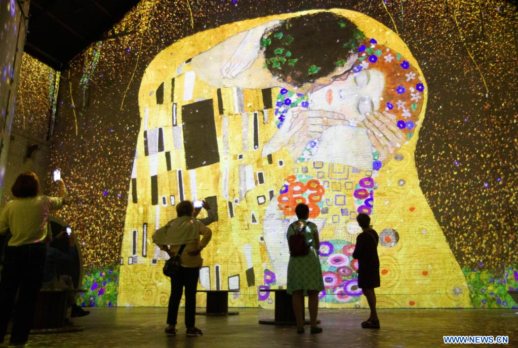 AMSTERDAM, 18 mai (Xinhua) -- Des visiteurs contemplent une œuvre d'art numérique lors d'une exposition dans l'espace d'exposition artistique "Fabrique des Lumières" à Amsterdam, aux Pays-Bas, le 18 mai 2022. Utilisant une technologie de pointe mariant des projections lumineuses et des musiques, la "Fabrique des Lumières" propose des expositions immersives d'artistes classiques, modernes et contemporains. (Xinhua/Sylvia Lederer)