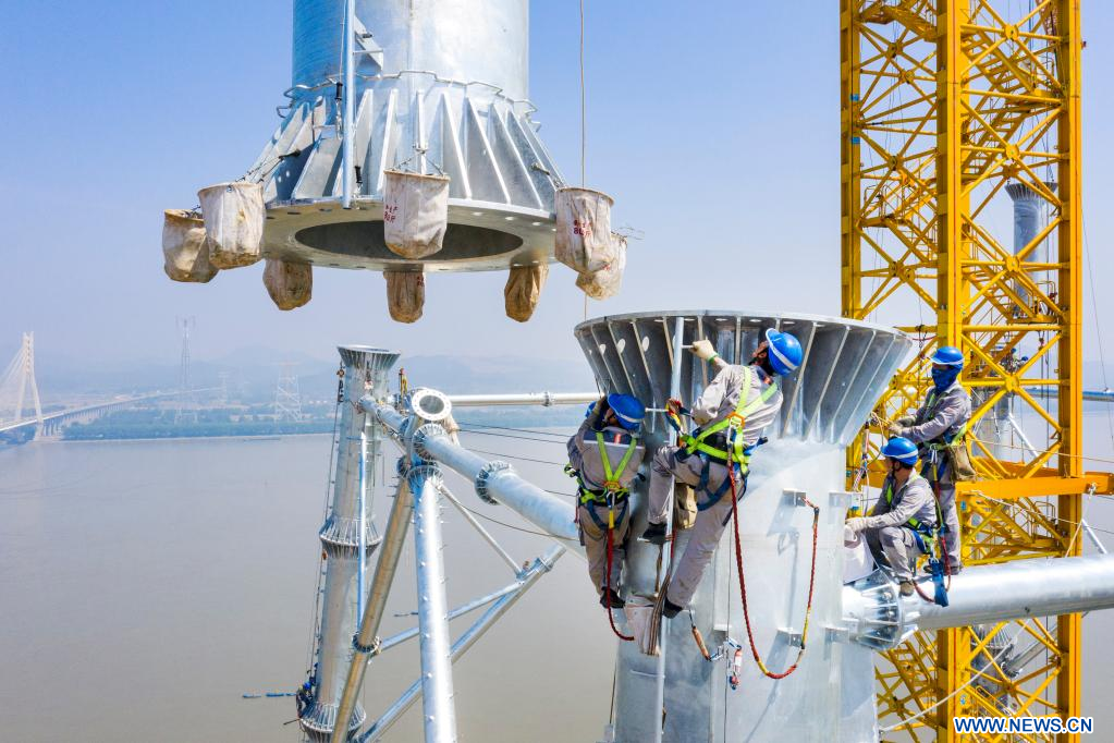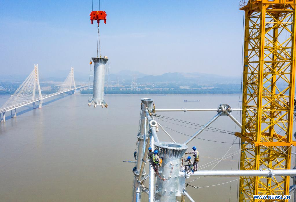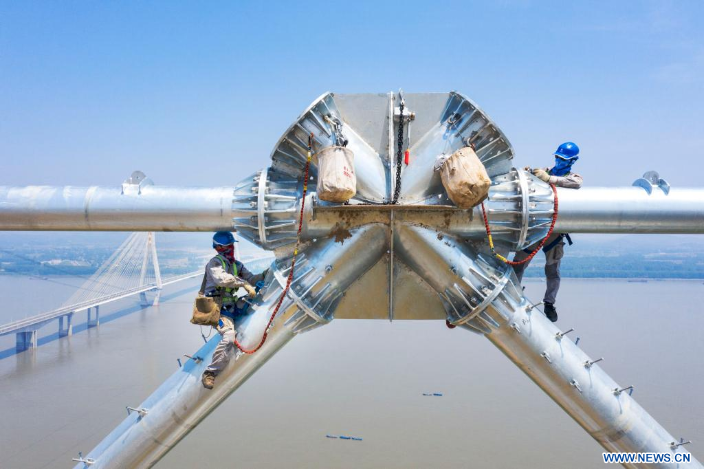 CHIZHOU, 26 mai (Xinhua) -- Des techniciens sur le chantier du projet de transmission d'électricité à ultra-haute tension Baihetan-Zhejiang près du fleuve Yangtsé, dans la province chinoise de l'Anhui (est), le 25 mai 2022. (Photo : Zheng Xianlie)