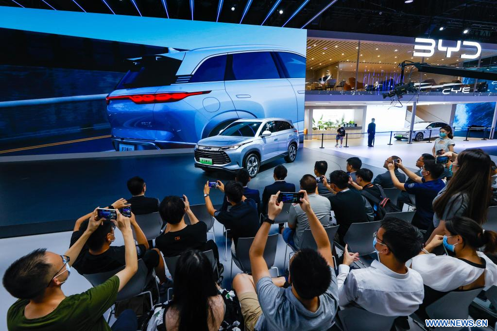 CHENGDU, 27 août (Xinhua) -- Des visiteurs prennent des photos d'un véhicule de BYD, fabricant chinois de véhicules à énergie nouvelle, lors du Salon de l'automobile de Chengdu, capitale de la province chinoise du Sichuan (sud-ouest), le 26 août 2022. Le salon, rassemblant quelque 1.600 voitures de plus de cent marques chinoises et étrangères, a ouvert ses portes vendredi. (Photo : Shen Bohan)