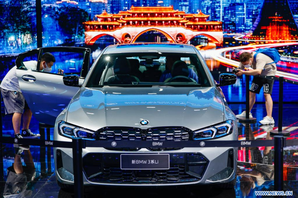 CHENGDU, 27 août (Xinhua) -- Des visiteurs prennent des photos d'un véhicule BMW présenté lors du Salon de l'automobile de Chengdu, capitale de la province chinoise du Sichuan (sud-ouest), le 26 août 2022. Le salon, rassemblant quelque 1.600 voitures de plus de cent marques chinoises et étrangères, a ouvert ses portes vendredi. (Photo : Shen Bohan)