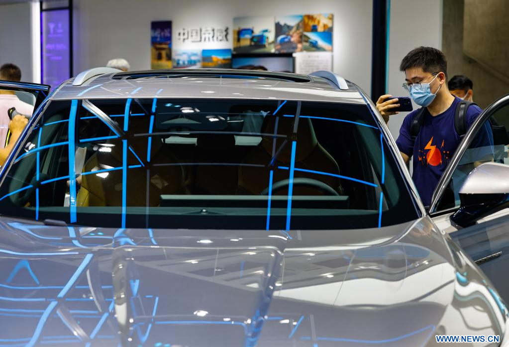 CHENGDU, 27 août (Xinhua) -- Un visiteur prend des photos d'un véhicule Roewe présenté lors du Salon de l'automobile de Chengdu, capitale de la province chinoise du Sichuan (sud-ouest), le 26 août 2022. Le salon, rassemblant quelque 1.600 voitures de plus de cent marques chinoises et étrangères, a ouvert ses portes vendredi. (Photo : Shen Bohan)