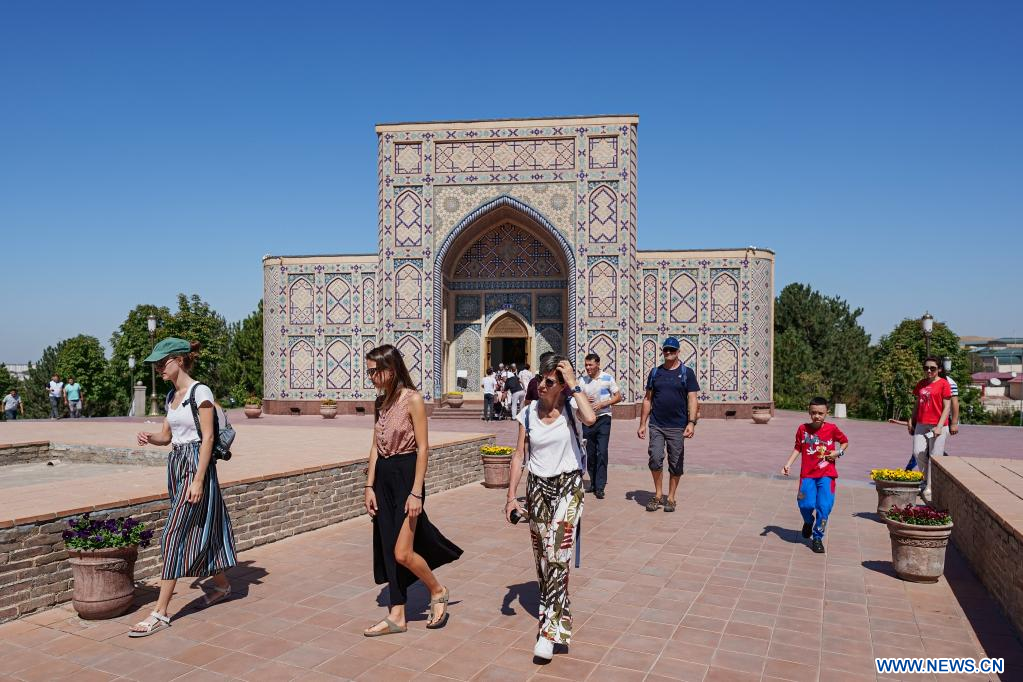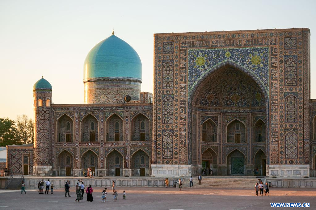 SAMARCANDE, 13 septembre (Xinhua) -- Des gens visitent la place du Régistan, à Samarcande, en Ouzbékistan, le 3 septembre 2022. Samarcande est la deuxième plus grande ville d'Ouzbékistan. Située sur l'ancienne Route de la Soie, cette ville constitue un carrefour des cultures du monde. (Xinhua)