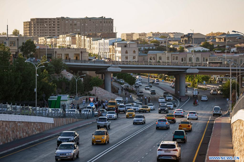 SAMARCANDE, 13 septembre (Xinhua) -- Des voitures circulent sur une grande artère de Samarcande, en Ouzbékistan, le 3 septembre 2022. Samarcande est la deuxième plus grande ville d'Ouzbékistan. Située sur l'ancienne Route de la soie, cette ville constitue un carrefour des cultures du monde. (Xinhua)