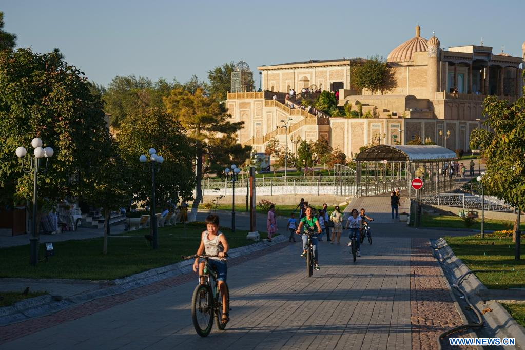 SAMARCANDE, 13 septembre (Xinhua) -- Des gens font du vélo à Samarcande, en Ouzbékistan, le 3 septembre 2022. Samarcande est la deuxième plus grande ville d'Ouzbékistan. Située sur l'ancienne Route de la Soie, cette ville constitue un carrefour des cultures du monde. (Xinhua)