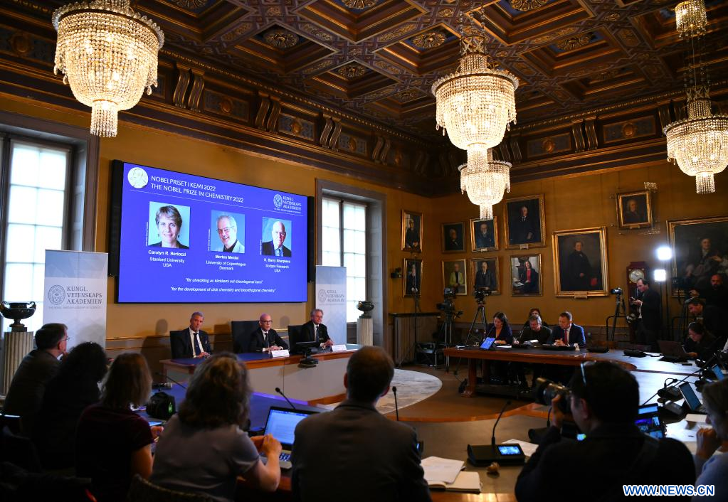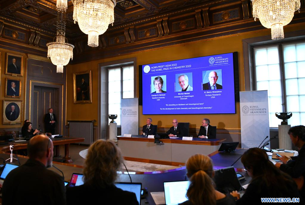 STOCKHOLM, 5 octobre (Xinhua) -- Carolyn R. Bertozzi et K. Barry Sharpless, scientifiques américains, et Morten Meldal, chercheur danois, se sont partagé le prix Nobel de chimie 2022 "pour le développement de la chimie clic et de la chimie bioorthogonale", a annoncé mercredi l'Académie royale des sciences de Suède.