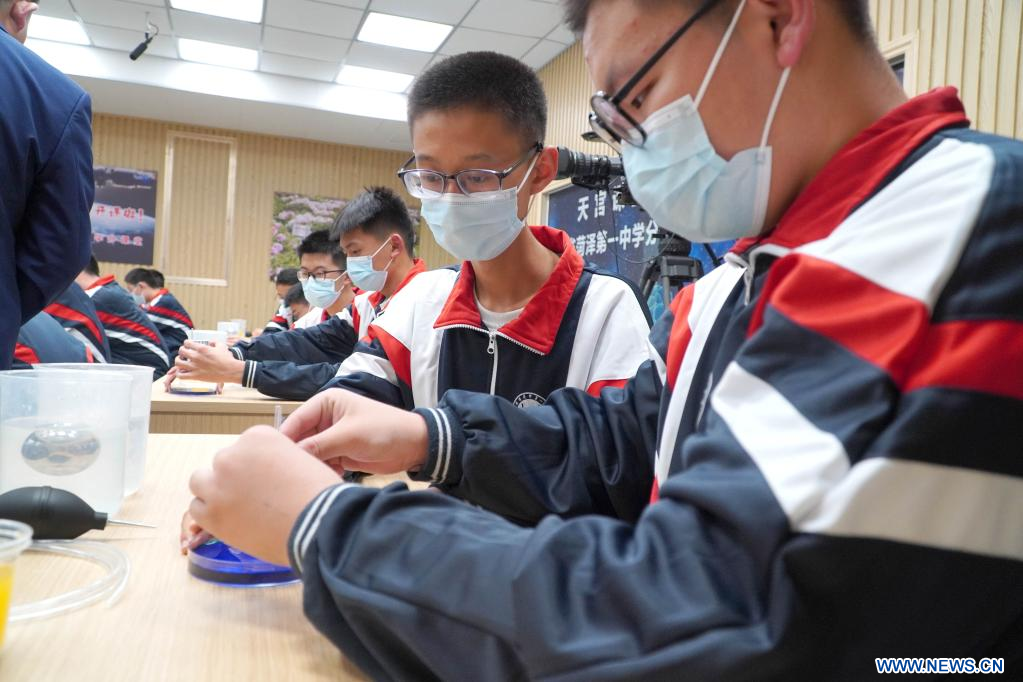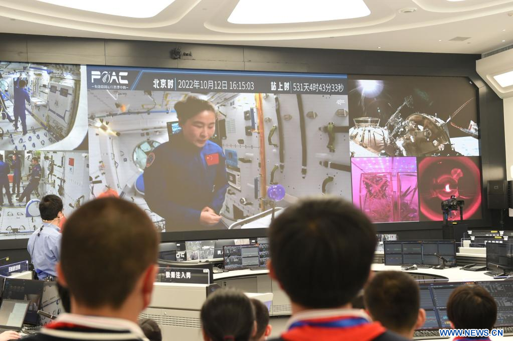 BEIJING, 12 octobre (Xinhua) -- Le troisième cours en direct de la station spatiale chinoise a eu lieu mercredi après-midi, donné par les membres de l'équipage de Shenzhou-14, à savoir Chen Dong, Liu Yang et Cai Xuzhe, à des étudiants sur Terre.