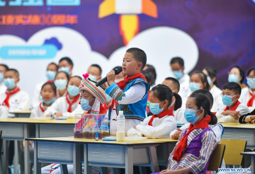 Un élève de sixième année de la province du Yunnan a partagé son test de germination d'Arabidopsis thaliana à l'école. Portant des lunettes à réalité mixte, Chen Dong a montré aux élèves l'Arabidopsis thaliana à différents stades de floraison dans une boîte à gants scientifique en microgravité.