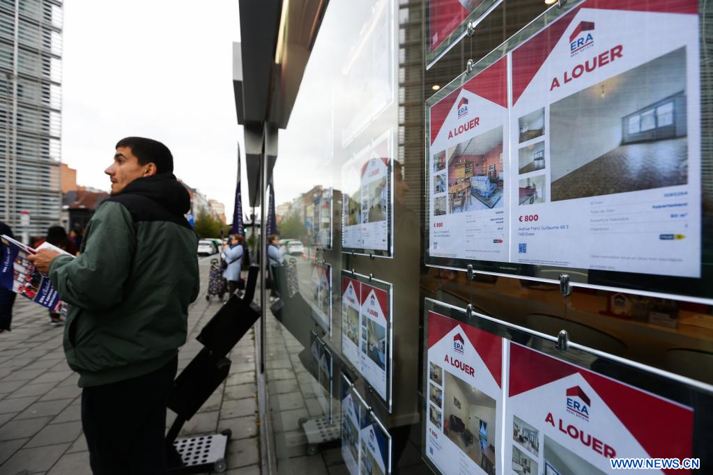 BRUXELLES, 4 novembre (Xinhua) -- Un homme se tient devant des annonces d'appartements à louer à Bruxelles, en Belgique, le 4 novembre 2022. Le taux d'inflation annuel de la zone euro a été de 10,7% en octobre 2022, contre 9,9% en septembre. (Xinhua/Zheng Huansong)