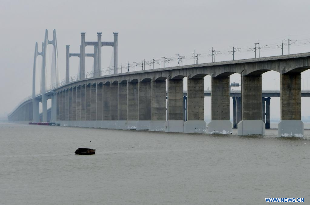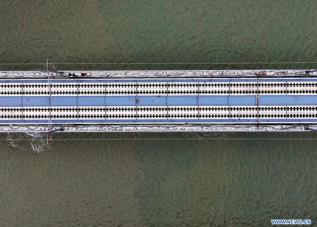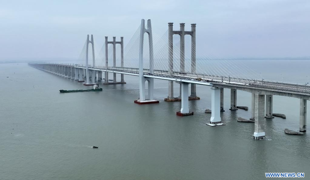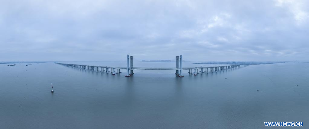 QUANZHOU, 5 février (Xinhua) -- Photo aérienne prise le 4 février 2023 du pont maritime de la baie de Quanzhou, qui fait partie du chemin de fer à grande vitesse Fuzhou-Xiamen, dans la province chinoise du Fujian (sud-est). Le chemin de fer à grande vitesse Fuzhou-Xiamen est entré vendredi dans la phase d'inspection d'acceptation, ce qui marque l'achèvement fondamental de la construction de la partie principale de la ligne ferroviaire et de ses projets de soutien. Conçu pour une vitesse de 350km/h, le chemin de fer réduira la durée de trajet entre Fuzhou, capitale de la province et la destination touristique de Xiamen à moins d'une heure. (Photo : Zhou Yi)