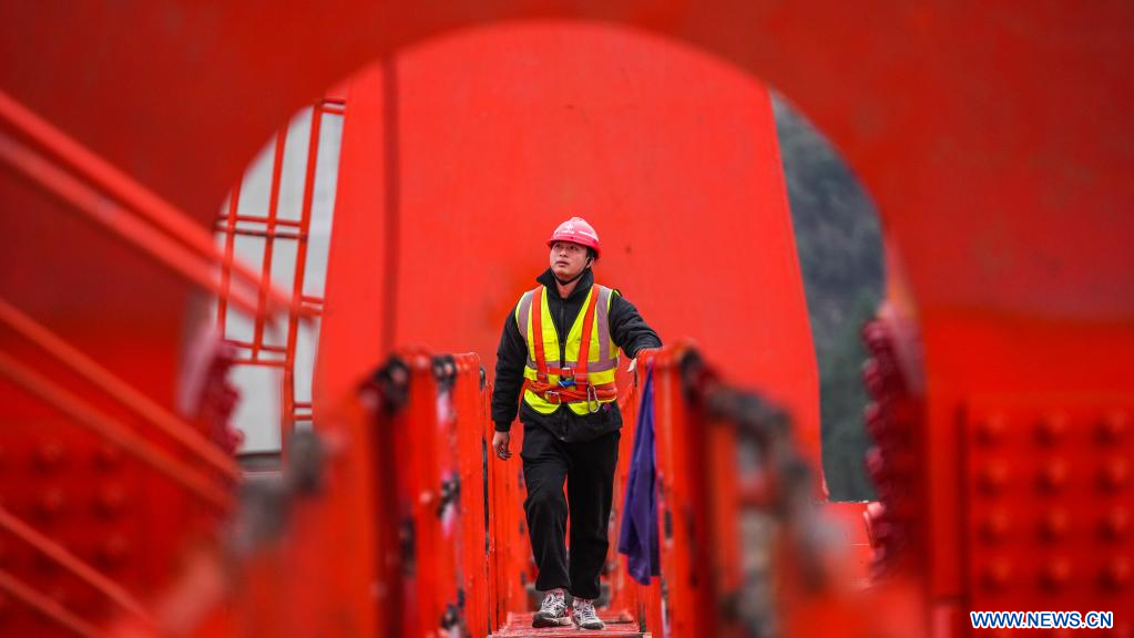 GUIYANG, 19 février (Xinhua) -- Un travailleur sur le chantier de construction du grand pont de Wujiang, un projet principal sur l'autoroute reliant Dejiang à Yuqing, dans la province chinoise du Guizhou (sud-ouest), le 16 février 2023. Le pont, situé à la jonction des districts de Sinan, Shiqian et Fenggang, dans la province du Guizhou, présente une longueur de 1.834 mètres et une travée de 504 mètres. (Photo : Tao Liang)