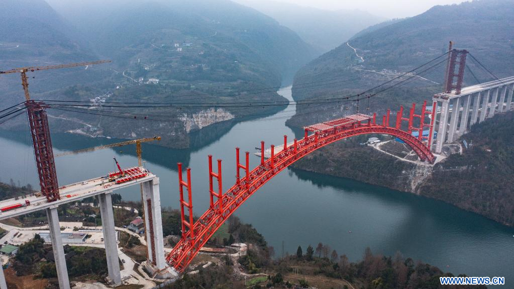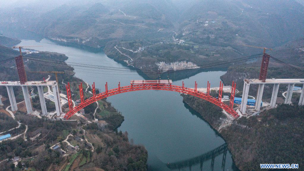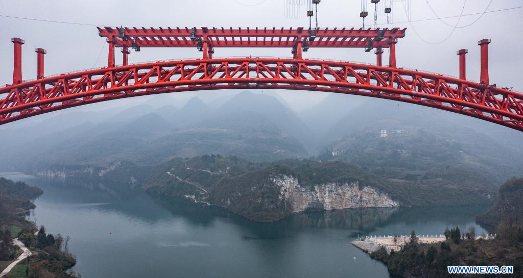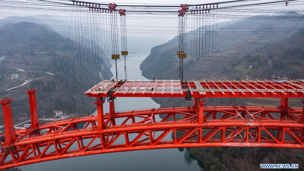GUIYANG, 19 février (Xinhua) -- Photo aérienne du chantier de construction du grand pont de Wujiang, un projet principal sur l'autoroute reliant Dejiang à Yuqing, dans la province chinoise du Guizhou (sud-ouest), le 17 février 2023. Le pont, situé à la jonction des districts de Sinan, Shiqian et Fenggang, dans la province du Guizhou, présente une longueur de 1.834 mètres et une travée de 504 mètres. (Photo : Tao Liang)