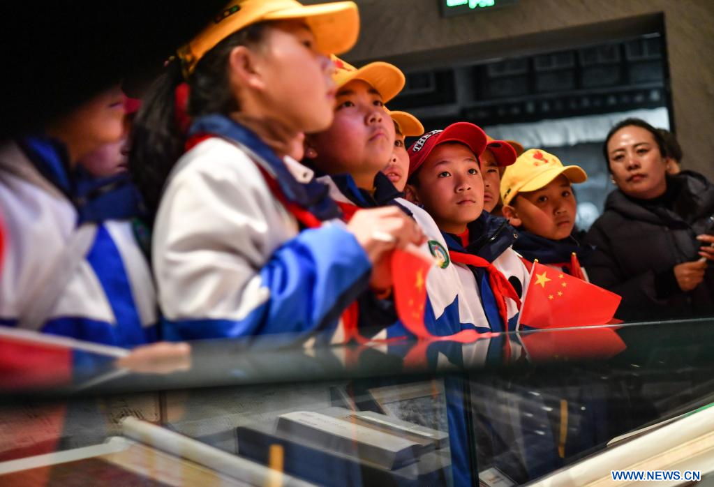 LHASSA, 29 mars (Xinhua) -- Des écoliers visitent un mémorial marquant l'émancipation de plus d'un million de serfs à l'occasion de la 15e Journée d'émancipation des serfs, à Lhassa, dans la région autonome du Tibet (sud-ouest de la Chine), le 28 mars 2023. La 15e Journée d'émancipation des serfs tombe mardi. (Photo : Jigme Dorje)