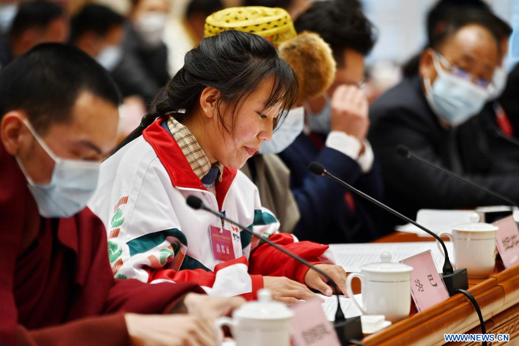 LHASSA, 29 mars (Xinhua) -- Une lycéenne (deuxième à gauche) prend la parole lors d'un symposium organisé à l'occasion de la 15e Journée d'émancipation des serfs, à Lhassa, dans la région autonome du Tibet (sud-ouest de la Chine), le 28 mars 2023. La 15e Journée d'émancipation des serfs tombe mardi. (Photo : Zhang Rufeng)