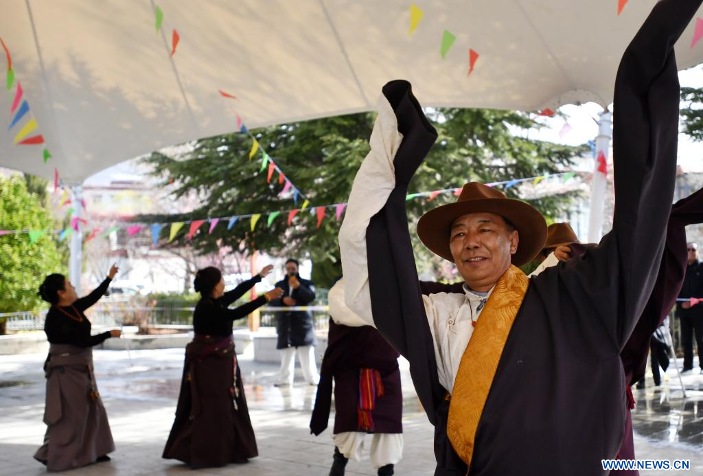 LHASSA, 29 mars (Xinhua) -- Des gens célèbrent la 15e Journée d'émancipation des serfs à Lhassa, dans la région autonome du Tibet (sud-ouest de la Chine), le 28 mars 2023. La 15e Journée d'émancipation des serfs tombe mardi. (Photo : Chogo)