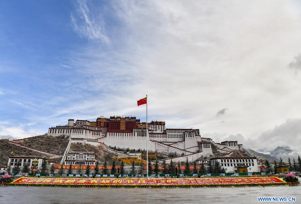 LHASSA, 29 mars (Xinhua) -- Le Palais du Potala à l'occasion de la 15e Journée d'émancipation des serfs, à Lhassa, dans la région autonome du Tibet (sud-ouest de la Chine), le 28 mars 2023. La 15e Journée d'émancipation des serfs tombe mardi. (Photo : Jigme Dorje)