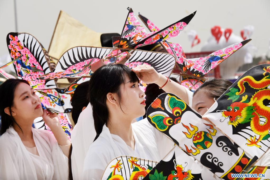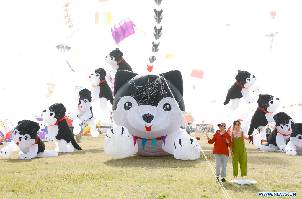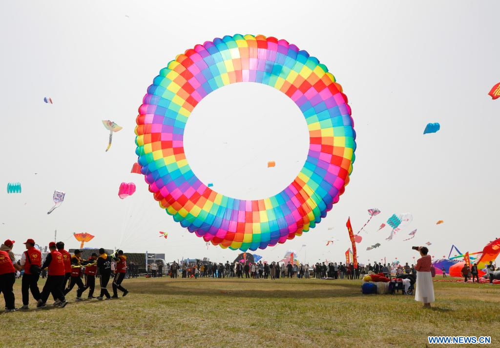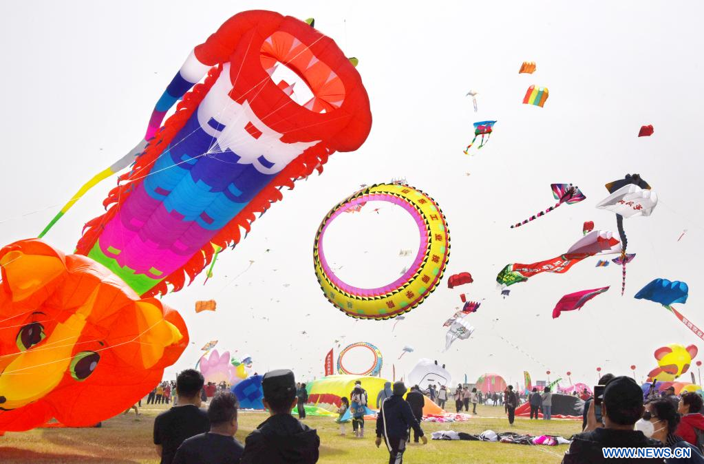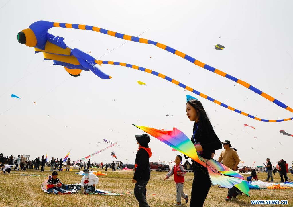 WEIFANG, 16 avril (Xinhua) -- Des personnes participent au 40e Festival international du cerf-volant de Weifang, dans la ville de Weifang de la province orientale du Shandong, le 15 avril 2023. Cet événement annuel s'est ouvert samedi à Weifang. (Photo : Sun Shubao)