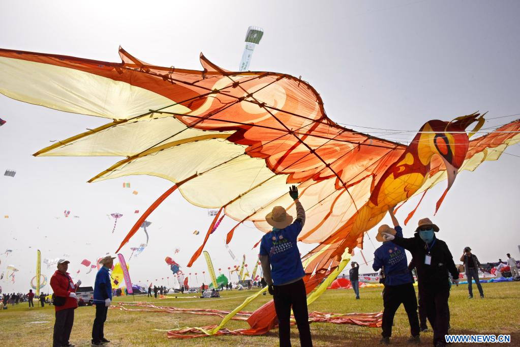 WEIFANG, 16 avril (Xinhua) -- Des personnes font voler un cerf-volant en forme de phénix lors du 40e Festival international du cerf-volant de Weifang, dans la ville de Weifang de la province orientale du Shandong, le 15 avril 2023. Cet événement annuel s'est ouvert samedi à Weifang. (Photo : Li Ziheng)