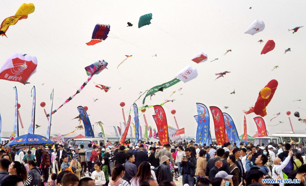 WEIFANG, 16 avril (Xinhua) -- Des personnes participent au 40e Festival international du cerf-volant de Weifang, dans la ville de Weifang de la province orientale du Shandong, le 15 avril 2023. Cet événement annuel s'est ouvert samedi à Weifang. (Photo : Li Ziheng)