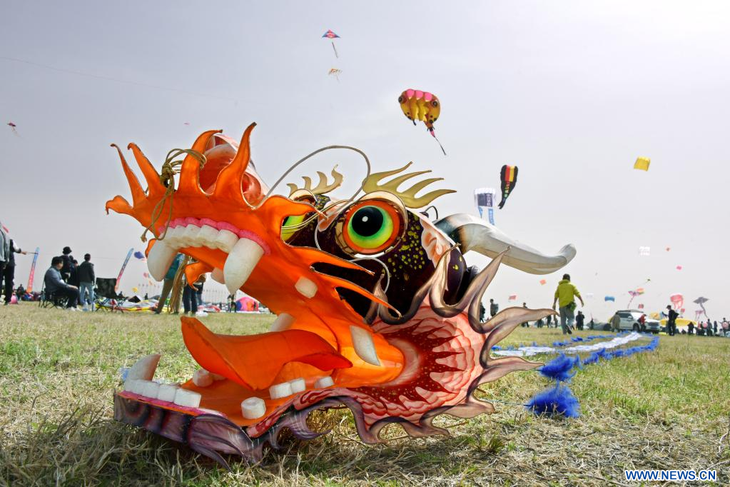 WEIFANG, 16 avril (Xinhua) -- Un cerf-volant en forme de dragon lors du 40e Festival international du cerf-volant de Weifang, dans la ville de Weifang de la province orientale du Shandong, le 15 avril 2023. Cet événement annuel s'est ouvert samedi à Weifang. (Photo : Li Ziheng)