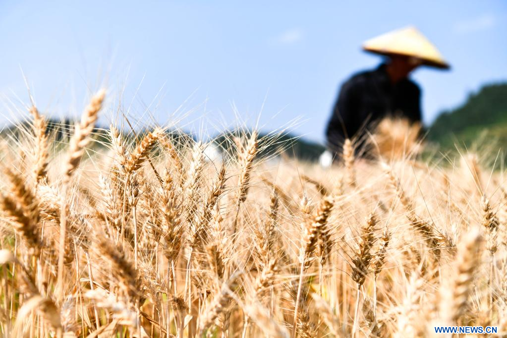 Un agriculteur récolte du blé dans un champ dans le village de Yantang du district de Kaiyang à Guiyang, dans la province chinoise du Guizhou (sud-ouest), le 31 mai 2023. (Xinhua/Yang Wenbin)
