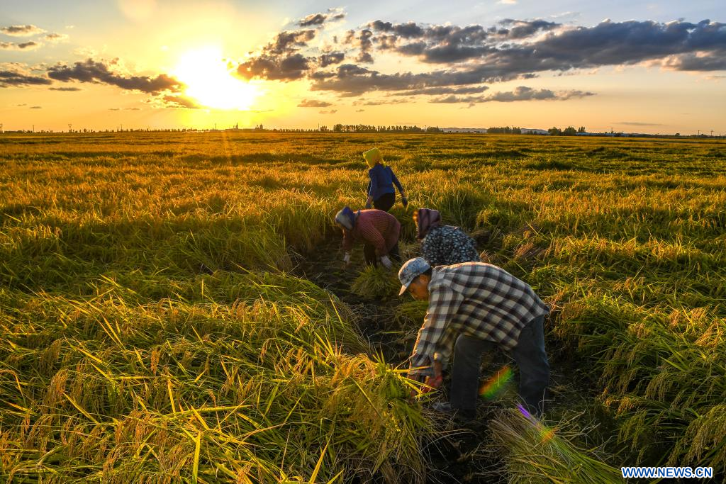 Des agriculteurs récoltent du riz dans une rizière du village de Huajia du bourg de Wanchang à Jilin, dans la province chinoise du Jilin (nord-est), le 12 septembre 2023. Le bourg de Wanchang, l'une des principales régions productrices de riz de la province du Jilin, entame la saison de la récolte du riz de cette année. (Xinhua/Zhang Nan)