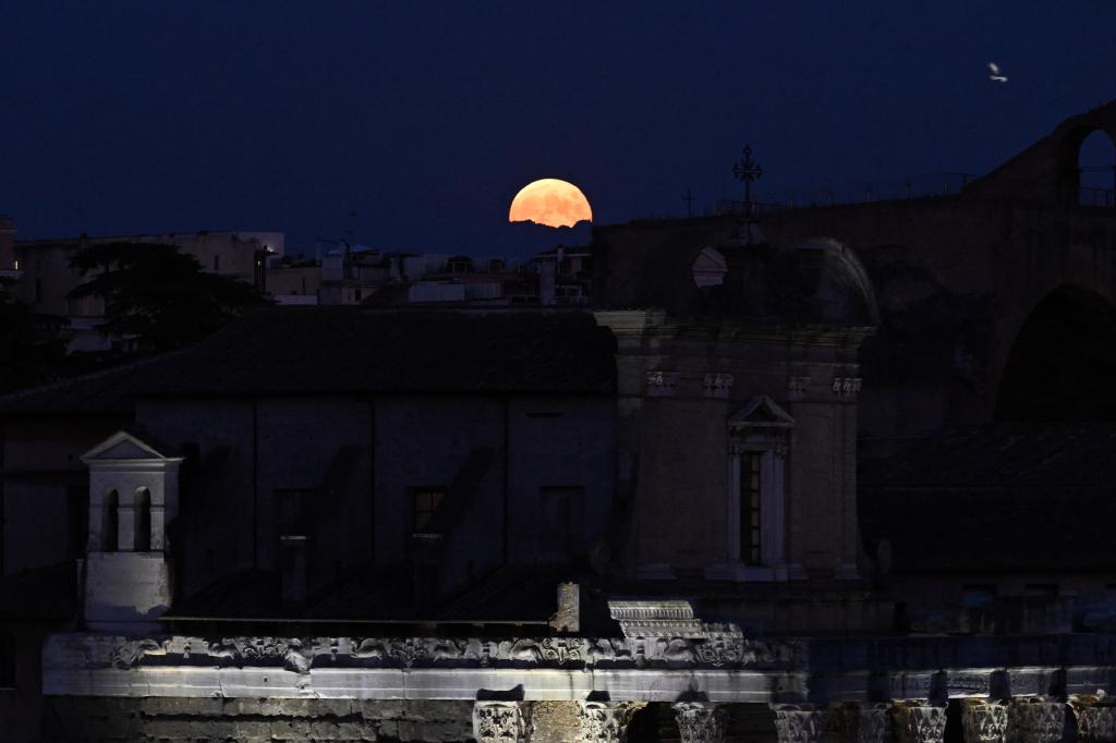 ROME, 30 septembre (Xinhua) -- Photo prise le 29 septembre 2023 montrant une pleine lune au-dessus de la ville de Rome, en Italie. (Xinhua/Alberto Lingria)