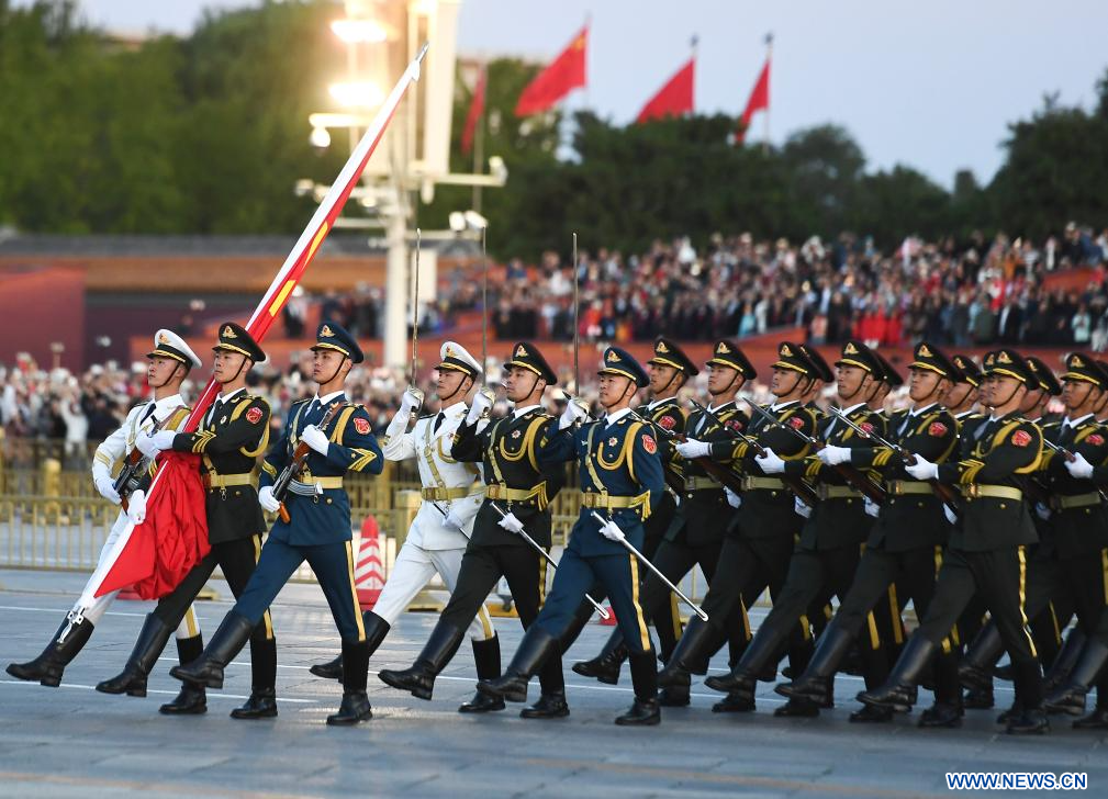 BEIJING, 1er octobre (Xinhua) -- Une cérémonie de lever du drapeau national se déroulant sur la place Tian'anmen, à Beijing, capitale chinoise, le 1er octobre 2023, pour célébrer le 74e anniversaire de la fondation de la République populaire de Chine. (Photo : Ju Huanzong)