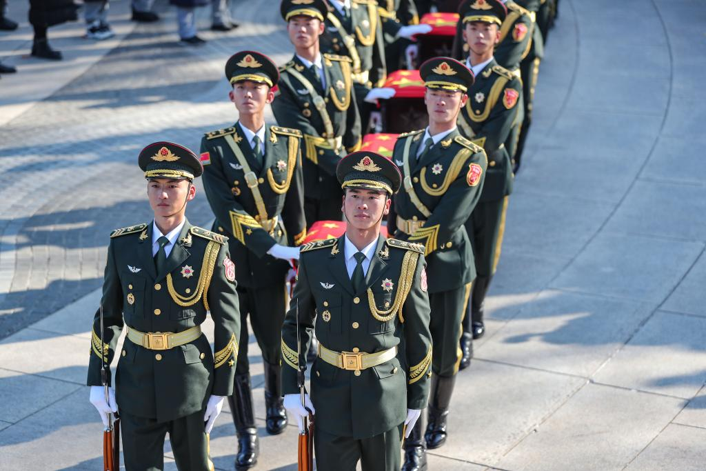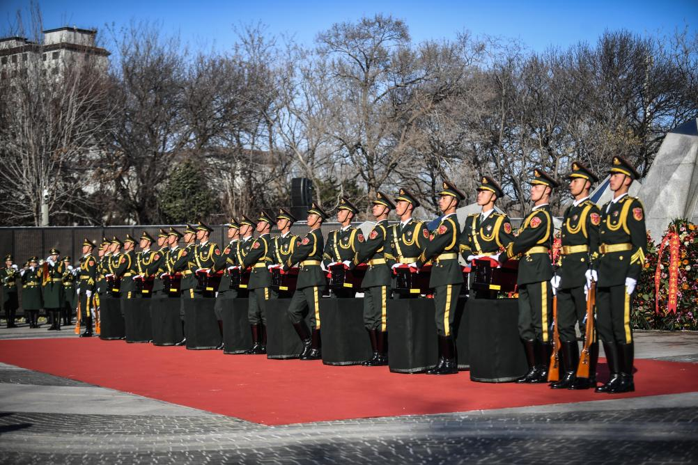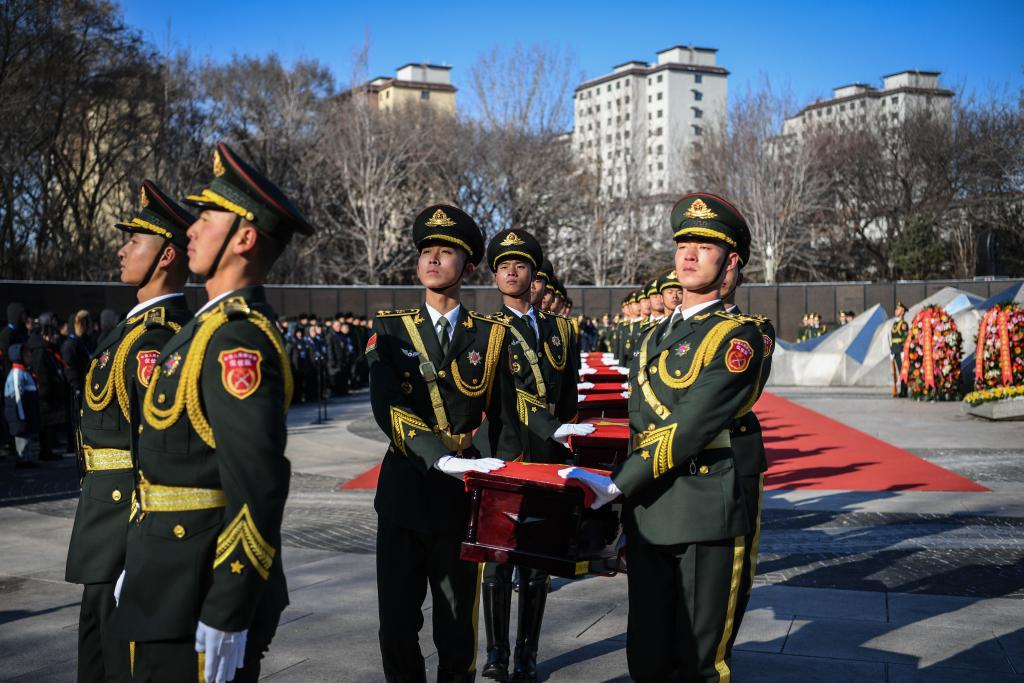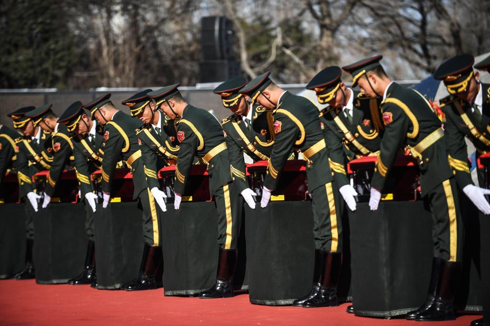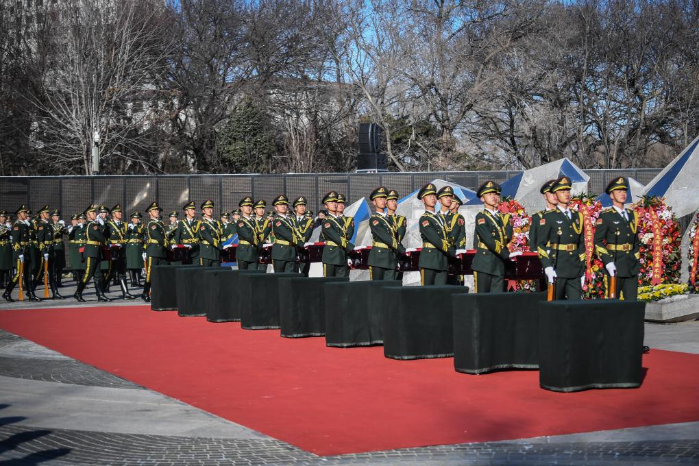 Des gardes d'honneur portant les cercueils des martyrs sont entrés dans le cimetière, escortés par des soldats de l'Armée populaire de Libération de Chine, tandis que l'hymne national retentissait en fond sonore.