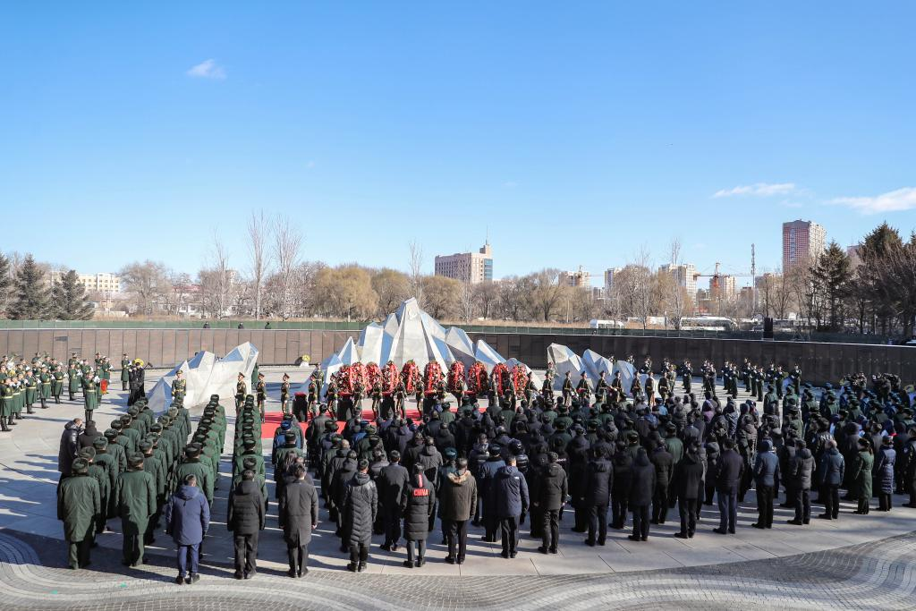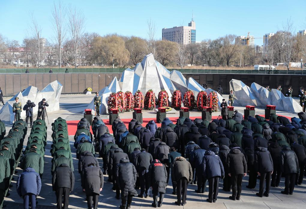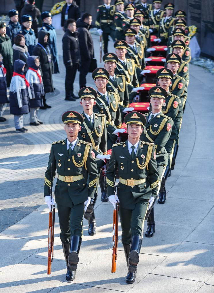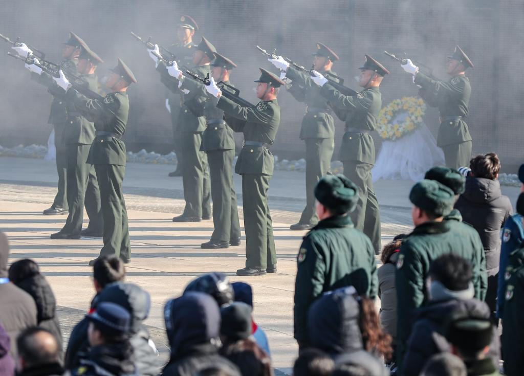Des gardes d'honneur portant les cercueils des martyrs sont entrés dans le cimetière, escortés par des soldats de l'Armée populaire de Libération de Chine, tandis que l'hymne national retentissait en fond sonore.