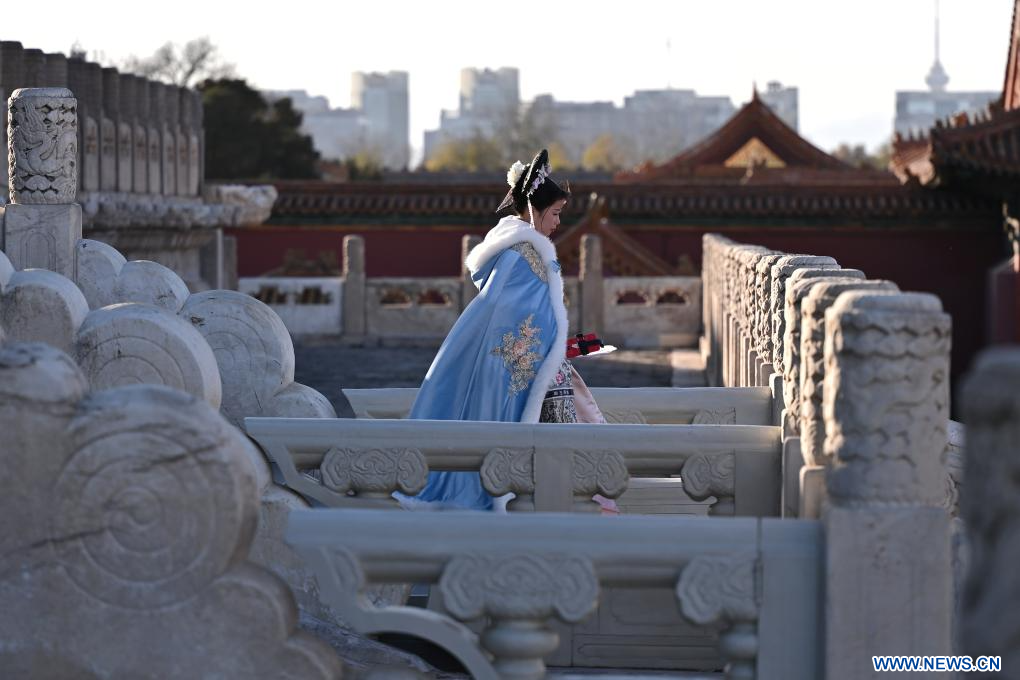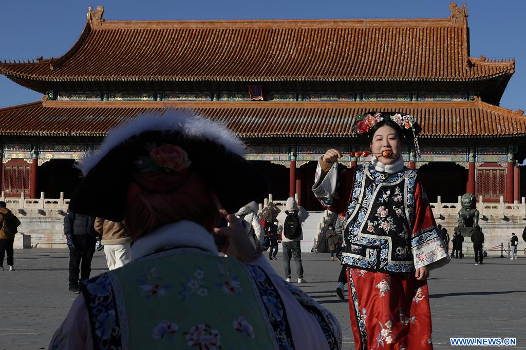 BEIJING, 30 novembre (Xinhua) -- Une touriste visite le Musée du Palais, également connu sous le nom de Cité interdite, à Beijing, capitale chinoise, le 29 novembre 2023. (Photo : Li Xin)