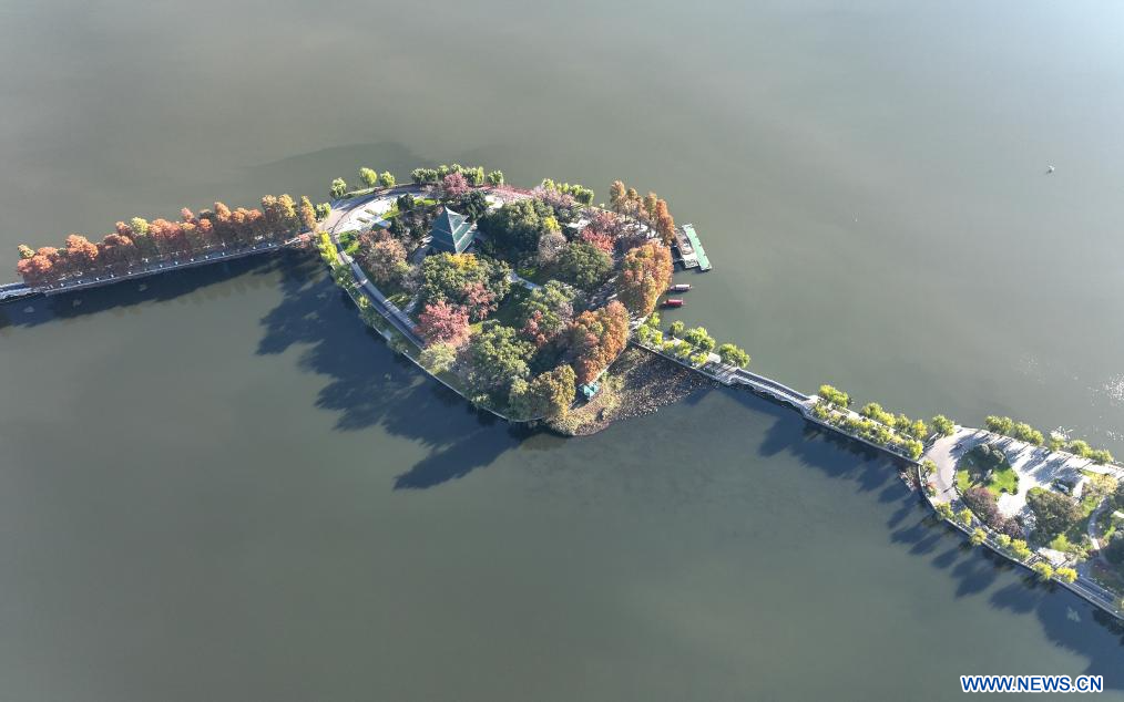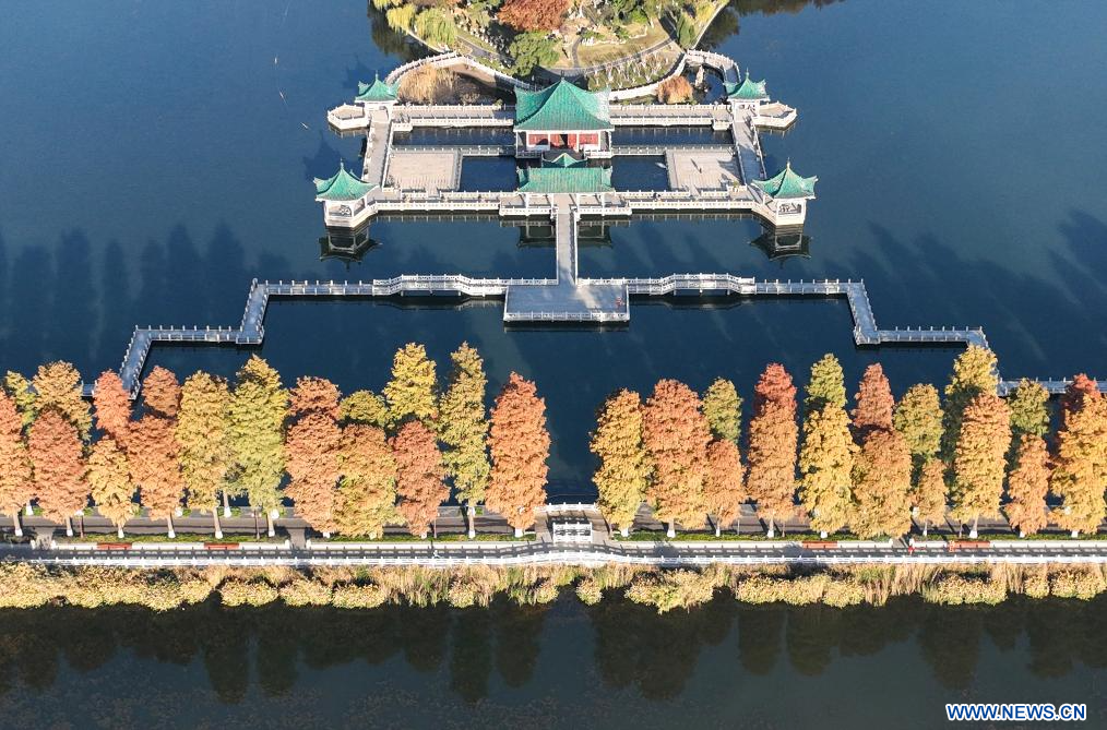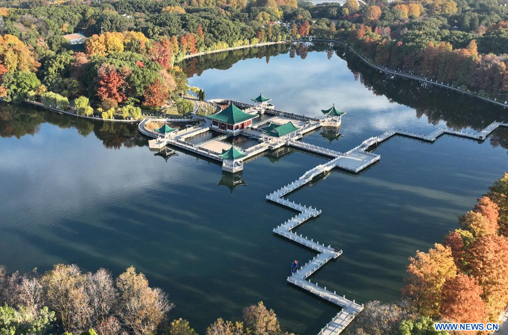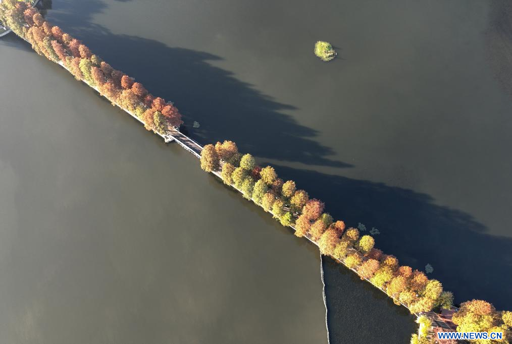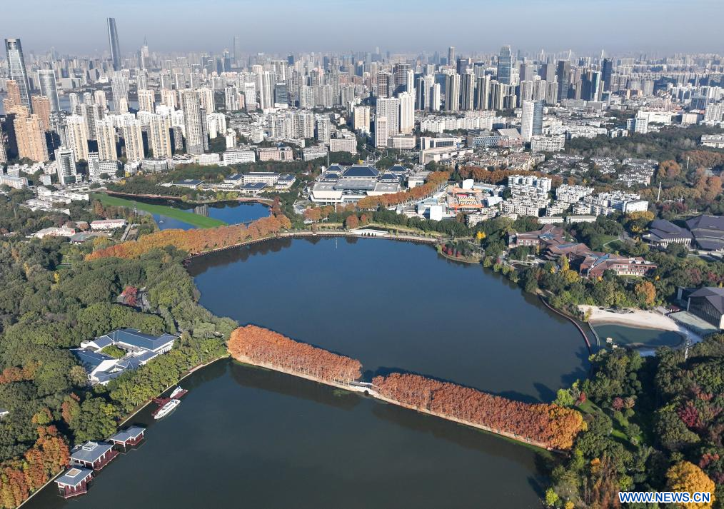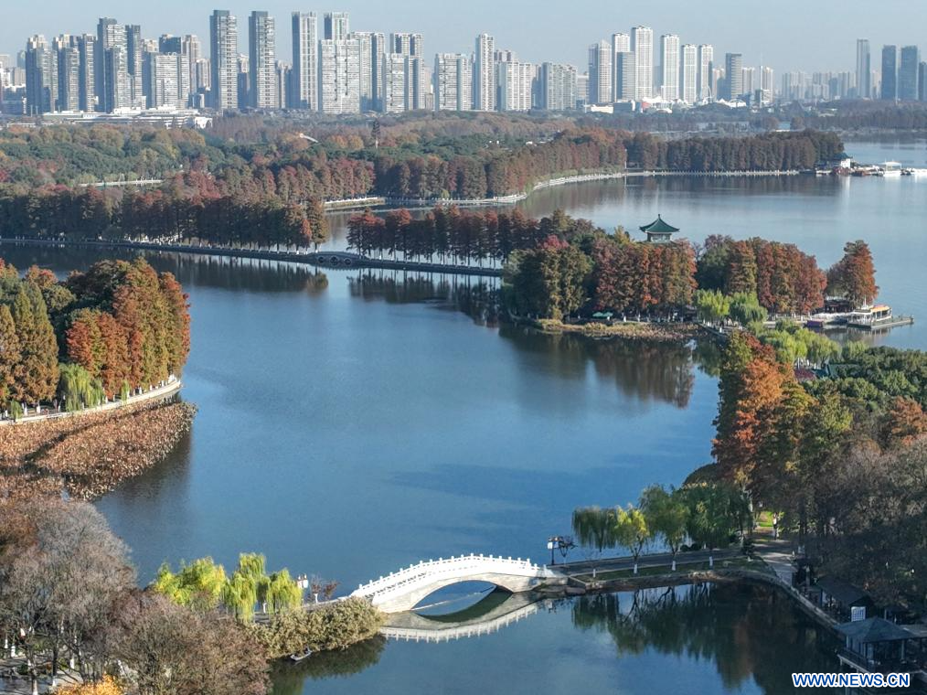 WUHAN, 1er décembre (Xinhua) -- Photo aérienne du paysage du lac Donghu, à Wuhan, dans la province chinoise du Hubei (centre), le 1er décembre 2023. (Photo : Cheng Min)