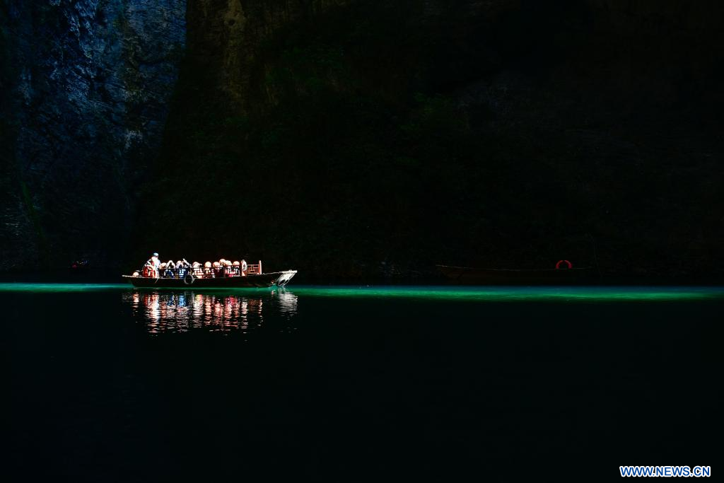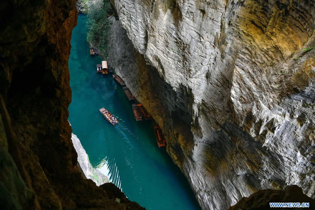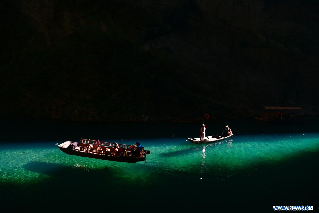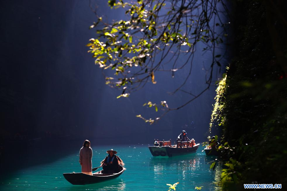 HEFENG, HUBEI, 5 décembre (Xinhua) -- Des visiteurs profitent du paysage du canyon de Pingshan, lieu touristique célèbre pour son eau limpide, dans le district de Hefeng de la préfecture autonome Tujia et Miao d'Enshi, dans la province chinoise du Hubei (centre), le 4 décembre 2023. (Photo : Yang Wenbin)