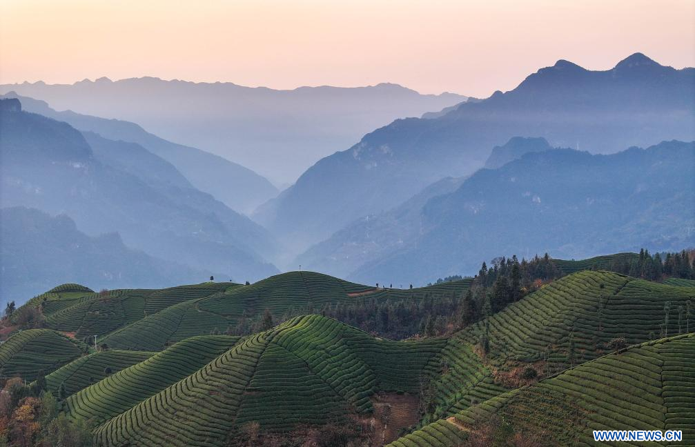Photo aérienne prise le 5 décembre 2023 montrant le paysage d'une plantation de thé dans le bourg de Zouma du district de Hefeng, dans la préfecture autonome Tujia et Miao d'Enshi de la province chinoise du Hubei (centre). (Xinhua/Yang Wenbin)