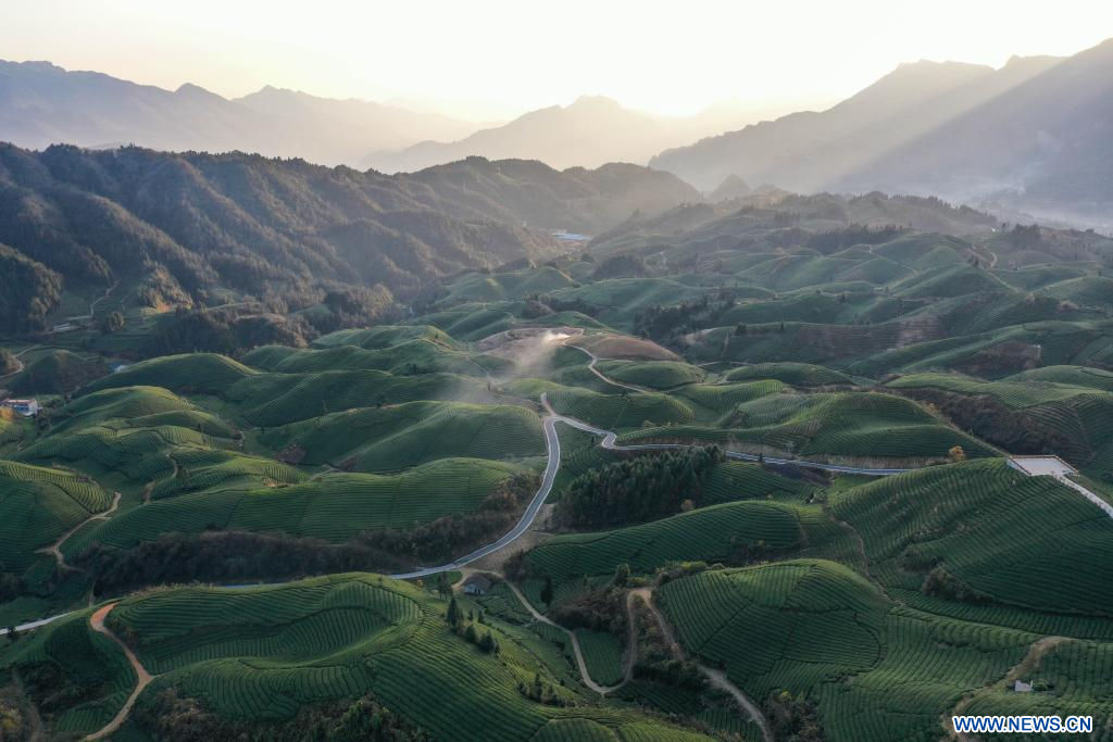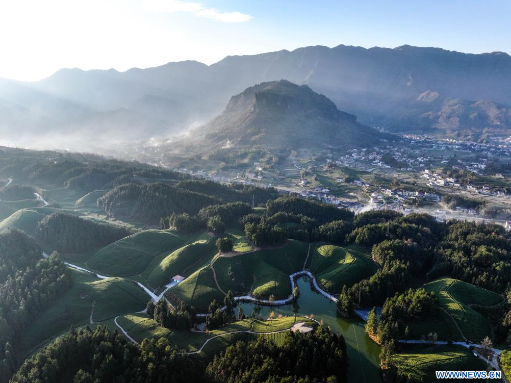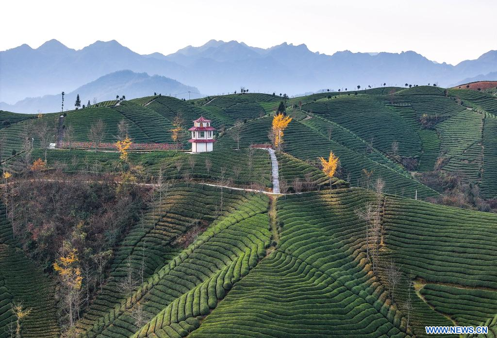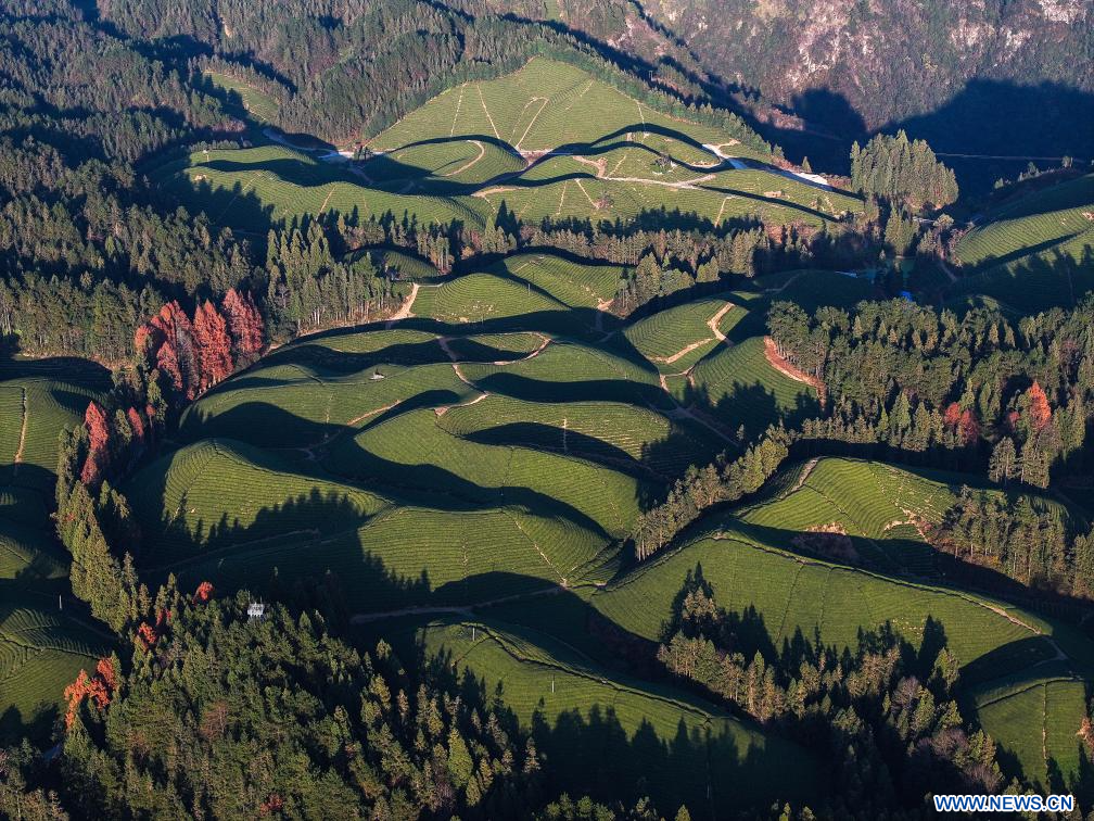 Photo aérienne prise le 6 décembre 2023 montrant le paysage d'une plantation de thé dans le bourg de Zouma du district de Hefeng, dans la préfecture autonome Tujia et Miao d'Enshi de la province chinoise du Hubei (centre). (Xinhua/Yang Wenbin)