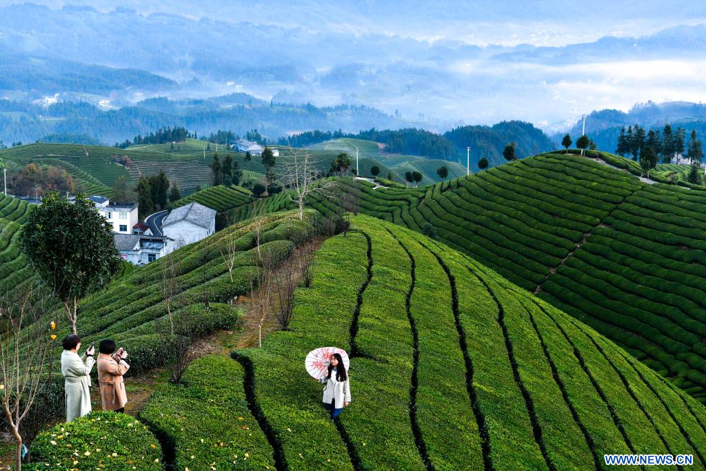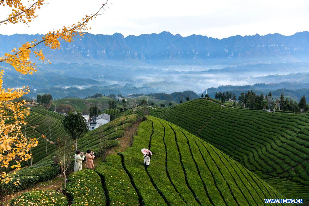 Des touristes visitent une plantation de thé dans le bourg de Zouma du district de Hefeng, dans la préfecture autonome Tujia et Miao d'Enshi de la province chinoise du Hubei (centre), le 6 décembre 2023. (Xinhua/Yang Wenbin)