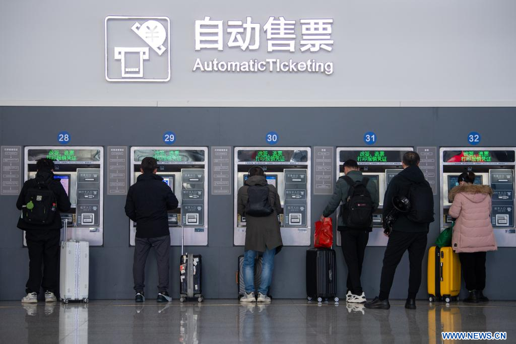 Des passagers utilisent des distributeurs automatiques de billets à la gare de l'est de Hangzhou, à Hangzhou, dans la province chinoise du Zhejiang (est), le 17 février 2024. (Photo : Jiang Han)